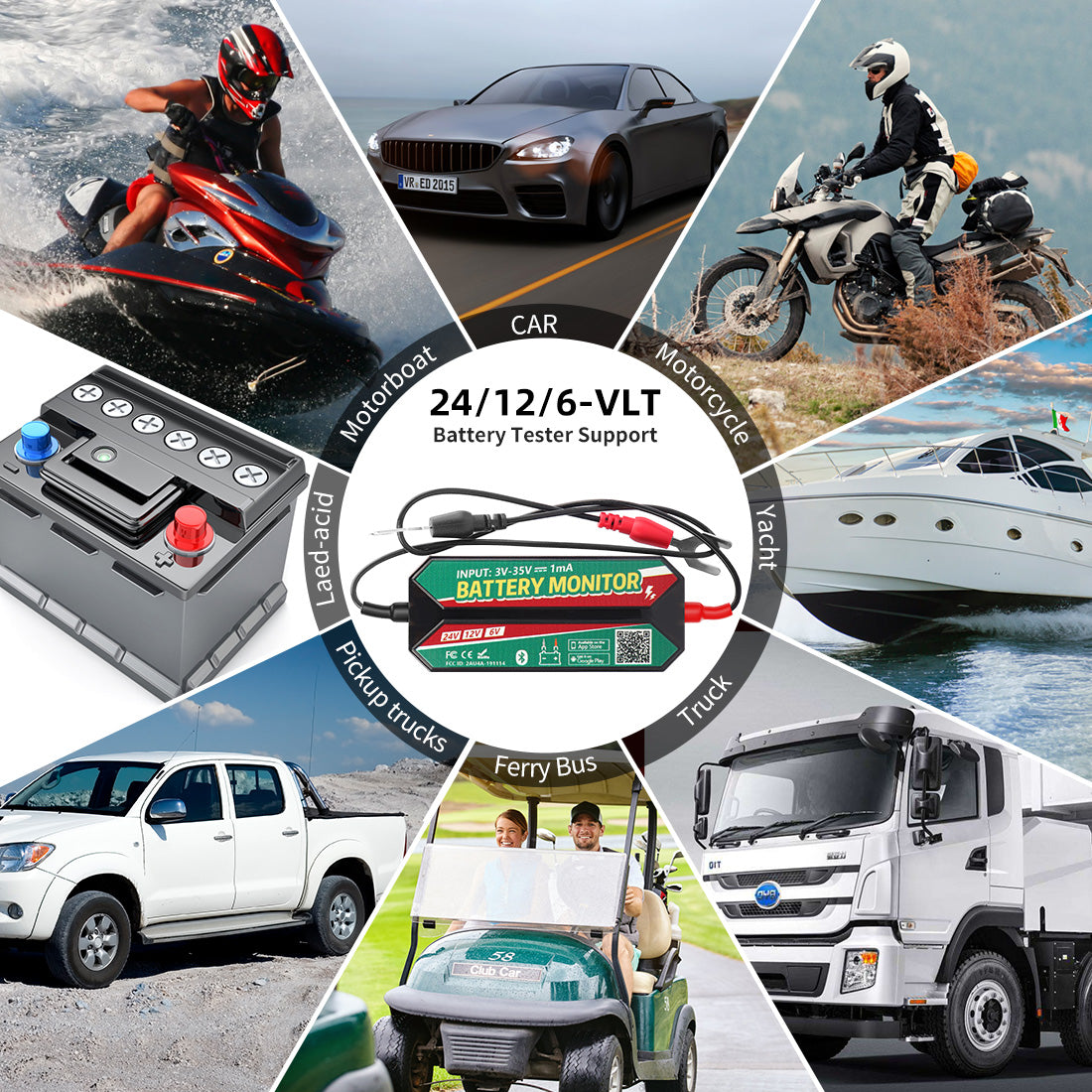 - Support 6V/12V/24V lead-acid batteries and lithium batteries, work for trucks, cars, motorcycles, boats, energy storage batteries;