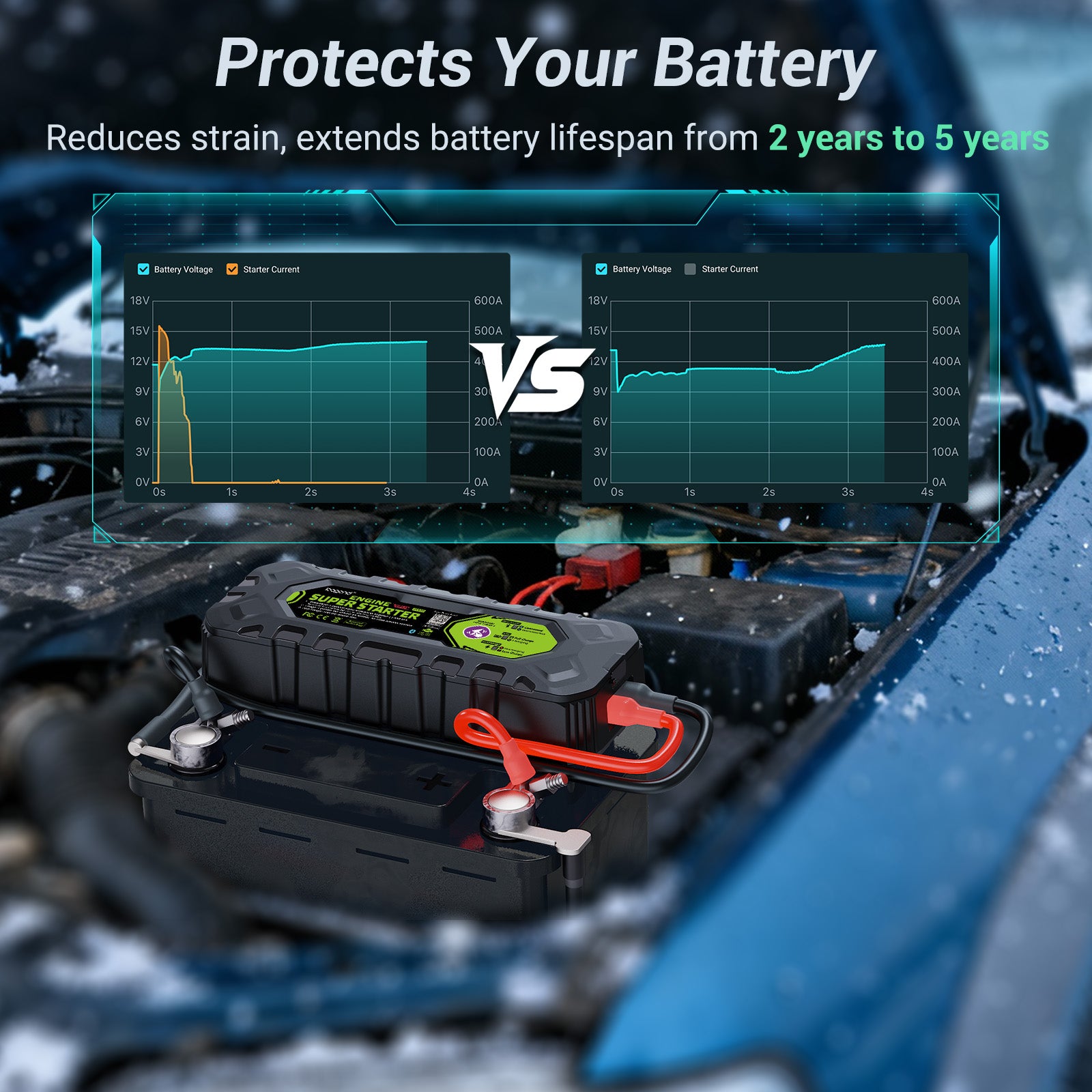 When starting your car, the Booster’s supercapacitors deliver the high peak current first, so your lead-acid battery doesn’t need to release large bursts of power.