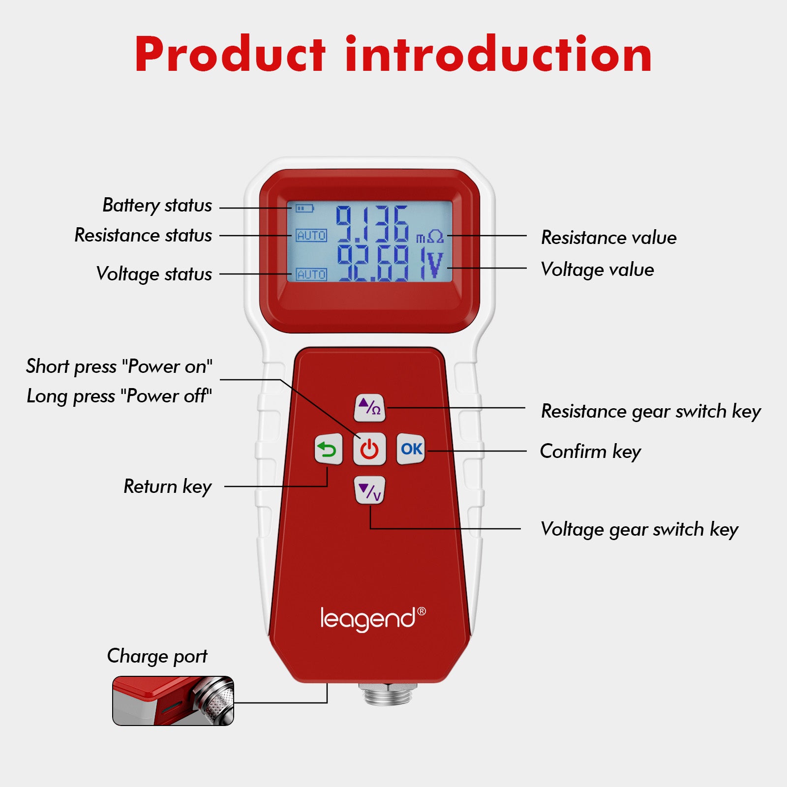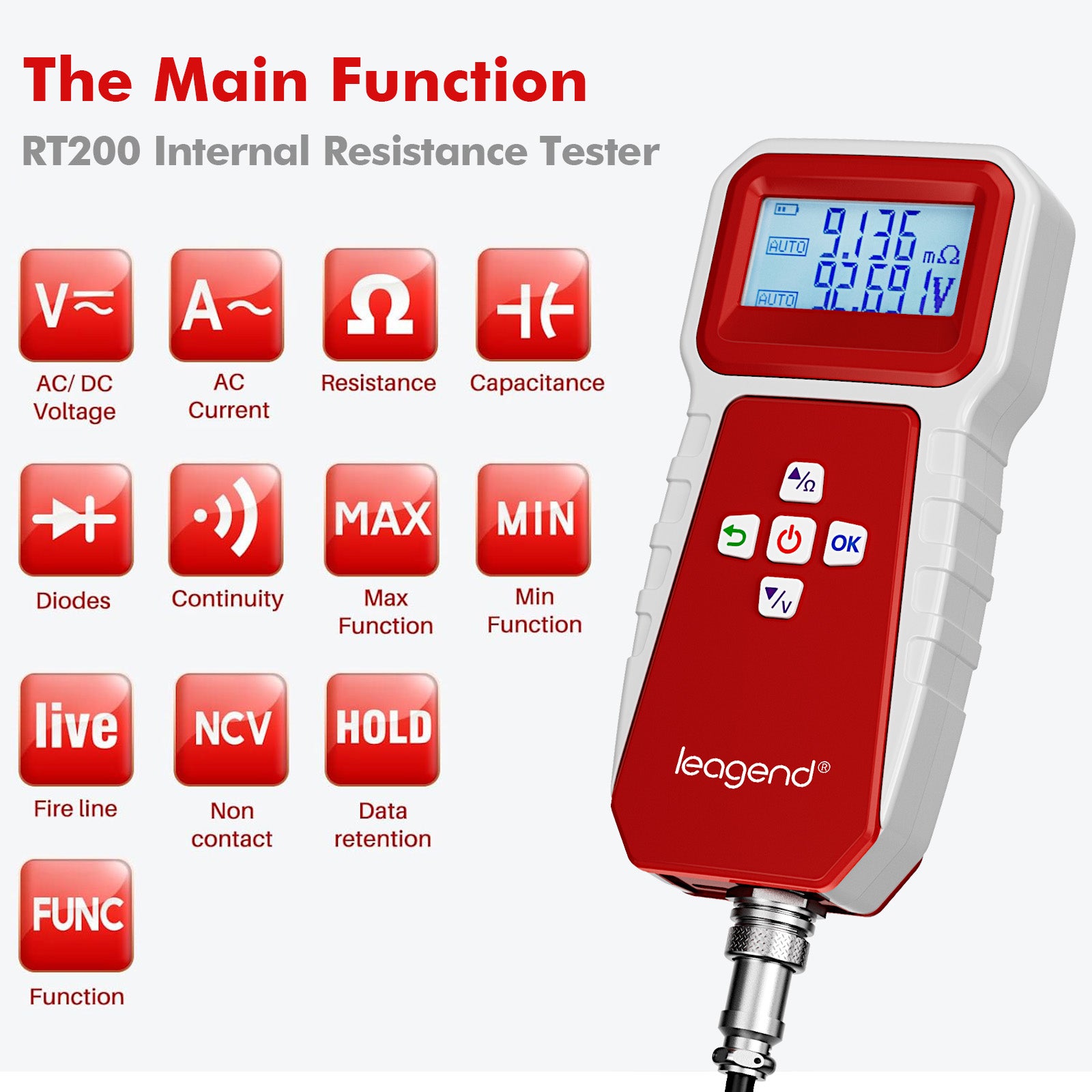 leagend RT200 is a precise tool designed to evaluate battery health by measuring internal resistance, a key indicator of battery lifespan. As battery health declines, internal resistance increases, providing a stable and reliable measure of performance. leagend RT200 can accurately measure internal resistance and voltage of batteries, with results automatically saved for future review.